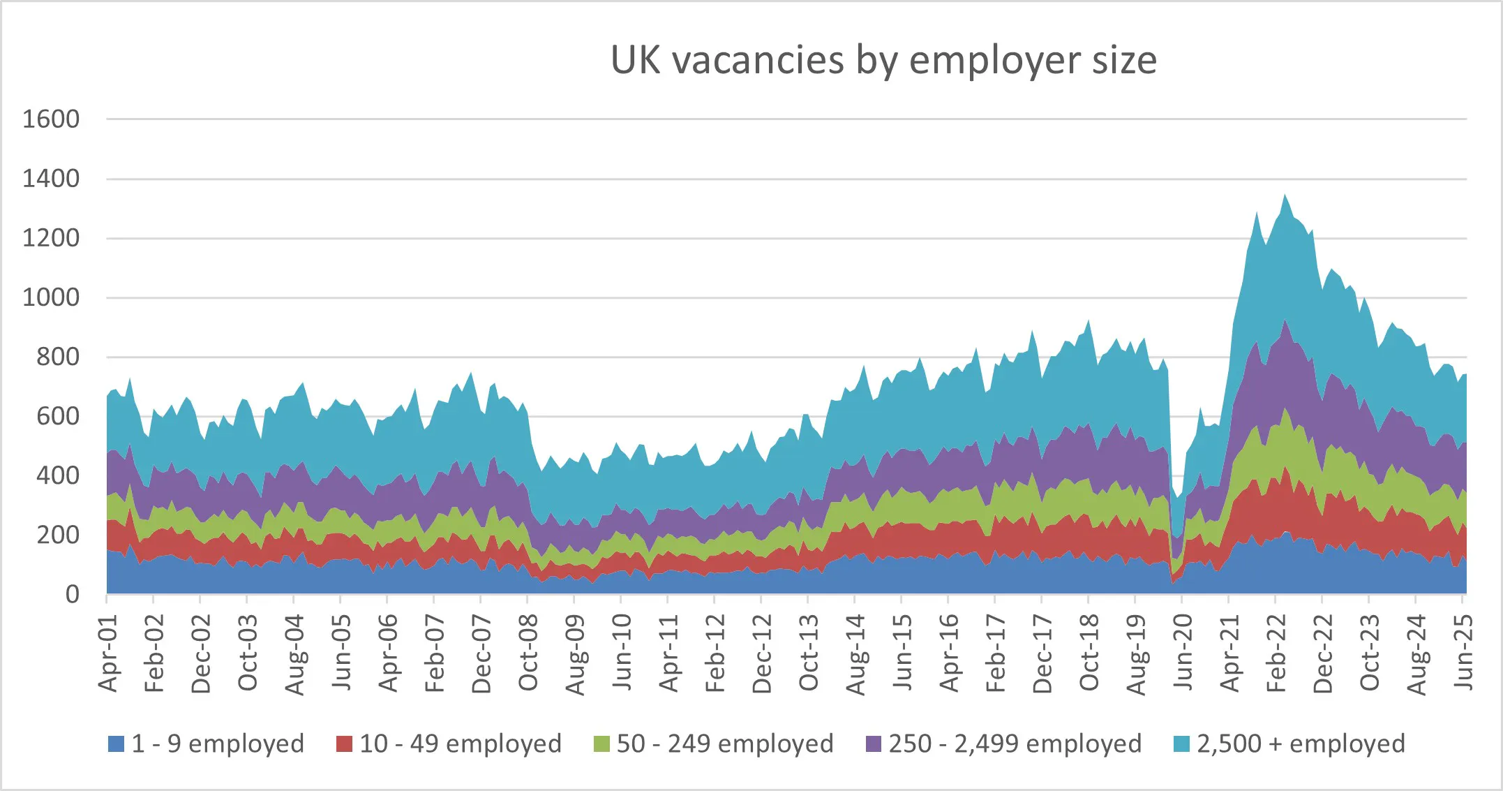 Plotting monthly data for all vacancies, it looks as if we're currently in a process of reverting to something like the long term trend, or perhaps slightly below that, but not in a recessionary state - yet. I've plotted the data by employer size back to 2001 below, so you can see where the peaks and troughs are. I have mentioned this in passing elsewhere but this really drives home quite how odd the post-COVID jobs market was - we haven't seen vacancy levels like the ones from mid 2021 to the end of 2023 for at least 20 years and probably ever, and until we collectively understand that then the current jobs market will seem weak in comparison to that period.