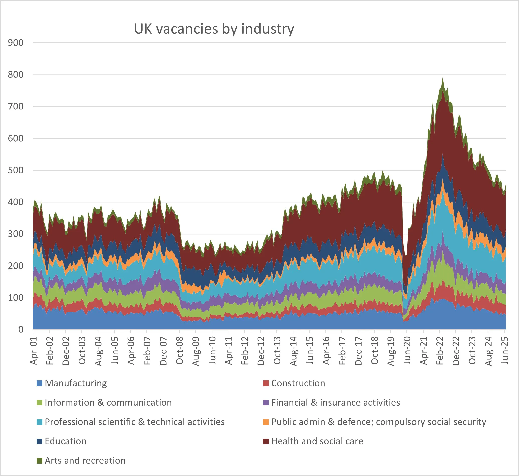 One thing you notice is that retail is having a very tough time right now with vacancy-to-staff ratios particularly low. IT is an interesting case too, in principle with a high vacancy ratio (suggesting worker shortage), but lower than usual - so it might be more appropriate to say that the long-term shortage of IT staff that has become such a permanent feature of the UK labour market that people are just generally accustomed to it might actually be in the process of fading. It's far from clear that this really is due to AI as some proponents have been saying, but there seems to be something going on - that said, there are signs of recovery in the last three months in IT so even that might only be temporary.